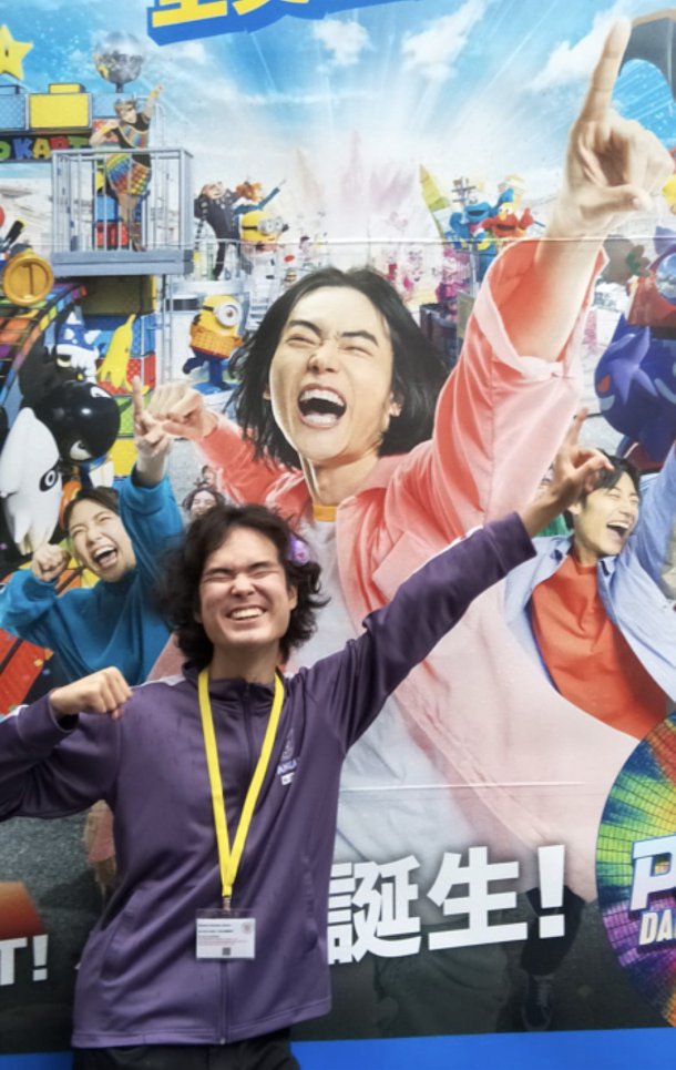 Kyle: At USJ, there was a poster of a man who was posing, and it looked exactly like me [Ed: see below!], so Charlotte suggested to pose in front of the poster to have a comparison, it was really funny.