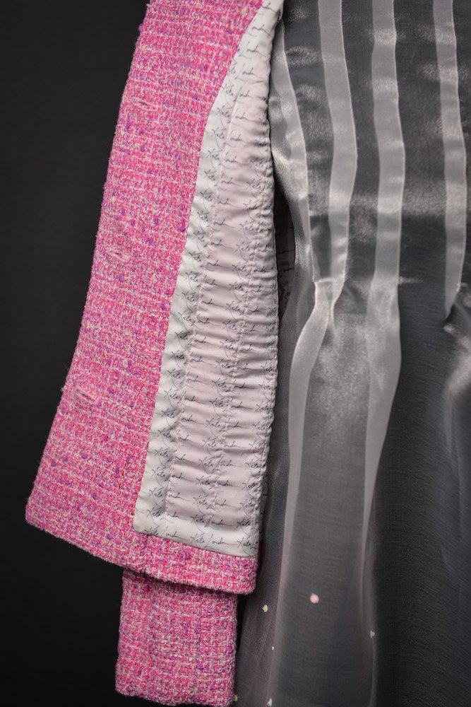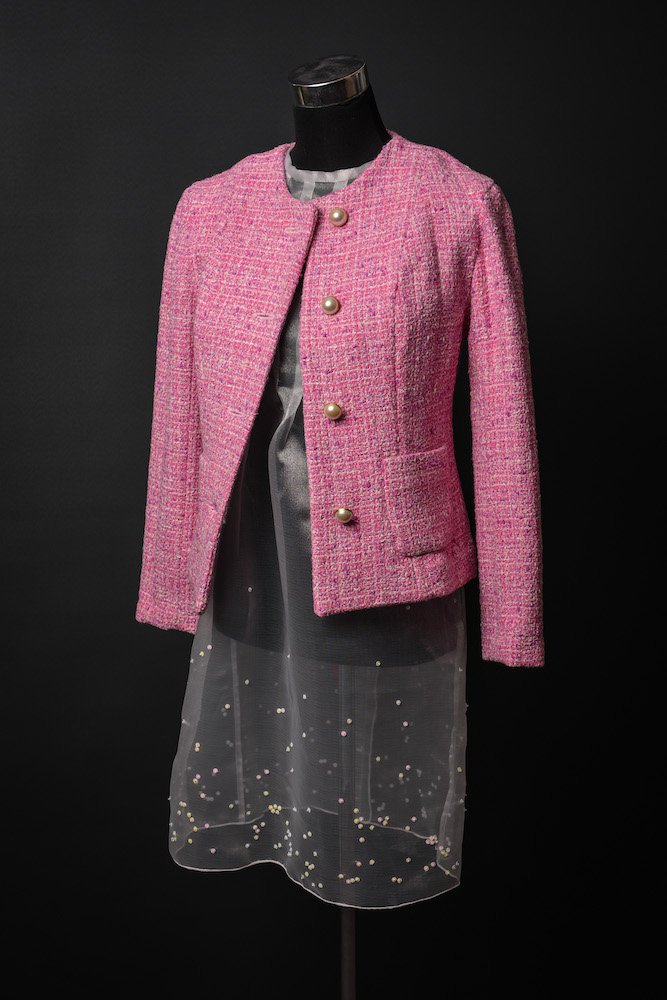 The outfit consists of a couture suit jacket and a 1960s-style babydoll dress. Textured wool bouclé fabric and digitally-printed fabric for the lining were used to create the jacket, and the dress was made from crystal organza fabric.