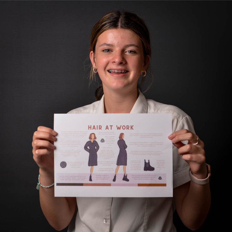 Special congratulations to Ella Gerritsen of Year 9, who was one of five Student Draw winners across Australia to be recognised for their participation in the competition. Ella received some EMU wool slippers, a Daily Edited notebook, Woolmark company keyring and tote bag, and a Frank Green bottle for her efforts. She designed a dress perfect for her sister as a hairdresser, who has just been awarded with the gold medal in hairdressing at the Worldskills Nationals in Melbourne!
